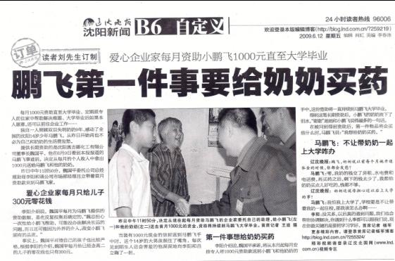 提供長(zhǎng)期資助的是沈陽(yáng)奧吉娜化工有限公司董事長(zhǎng)魏國(guó)平,他在6月9日看到本報(bào)報(bào)道的馬鵬飛事跡后,決定從每月的個(gè)人收入中拿出1000元送給馬鵬飛和他的奶奶。