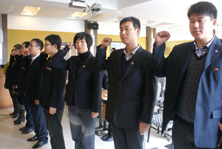 10月31日下午13:30,莊嚴肅穆的奧吉娜化工公司的會議室中,8位新黨員莊嚴的舉起右拳,宣誓入黨。
