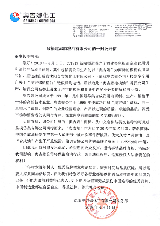 鑒于此事件對沈陽奧吉娜品牌的名譽損傷,我們特發(fā)公開信,以澄清:沈陽“奧吉娜”非福建“奧吉娜” “合成油”非“調(diào)和油”,并呼吁各行業(yè):品牌從無到有、從小到大、從大到強,其過程的艱辛就如同培養(yǎng)出一個出類拔萃的優(yōu)秀孩子,“中國質(zhì)造”的新時代不能再靠傍大款蹭名牌投機取巧追名逐利,需要用心創(chuàng)新、用智鑄質(zhì)才能真正打造名滿天下長盛不衰專業(yè)品牌,這樣的企業(yè)方能做到茁壯成長基業(yè)長青。