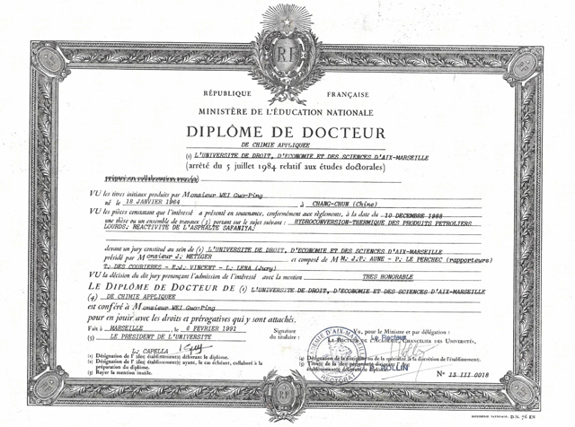 1988年12月10日,奧吉娜集團(tuán)創(chuàng)始人魏國(guó)平博士以“優(yōu)秀”成績(jī)通過(guò)了馬賽石油化學(xué)及工業(yè)有機(jī)合成學(xué)院EPSOI博士論文答辯,取得博士學(xué)位。